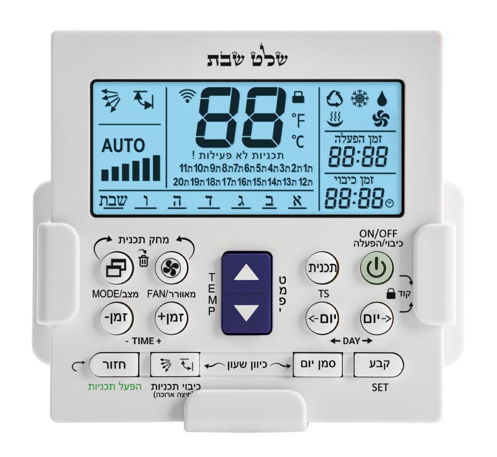 שלט שבת ייחודי וראשון מסוגו בעולם, פיתוח ישראלי, המאפשר הגדרה של 7 תוכניות שונות לכל יום בשבוע, לכיבוי והדלקה של המזגן ביום ובשעה ובטמפרטורה/עוצמה/קרור או חימום שאתם מתכננים מראש.