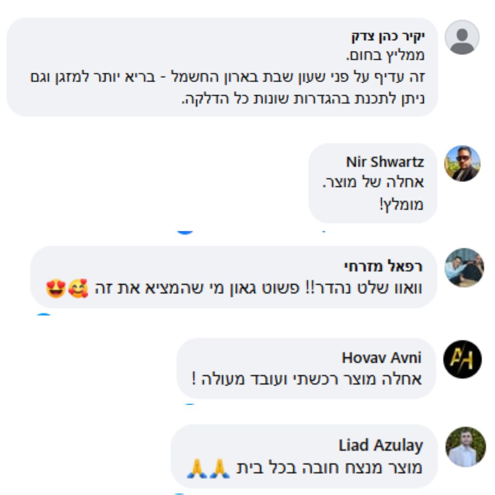 - ניתן להגדיר עד 7 תוכניות של כיבוי והדלקה מראש לכל יום בשבוע!